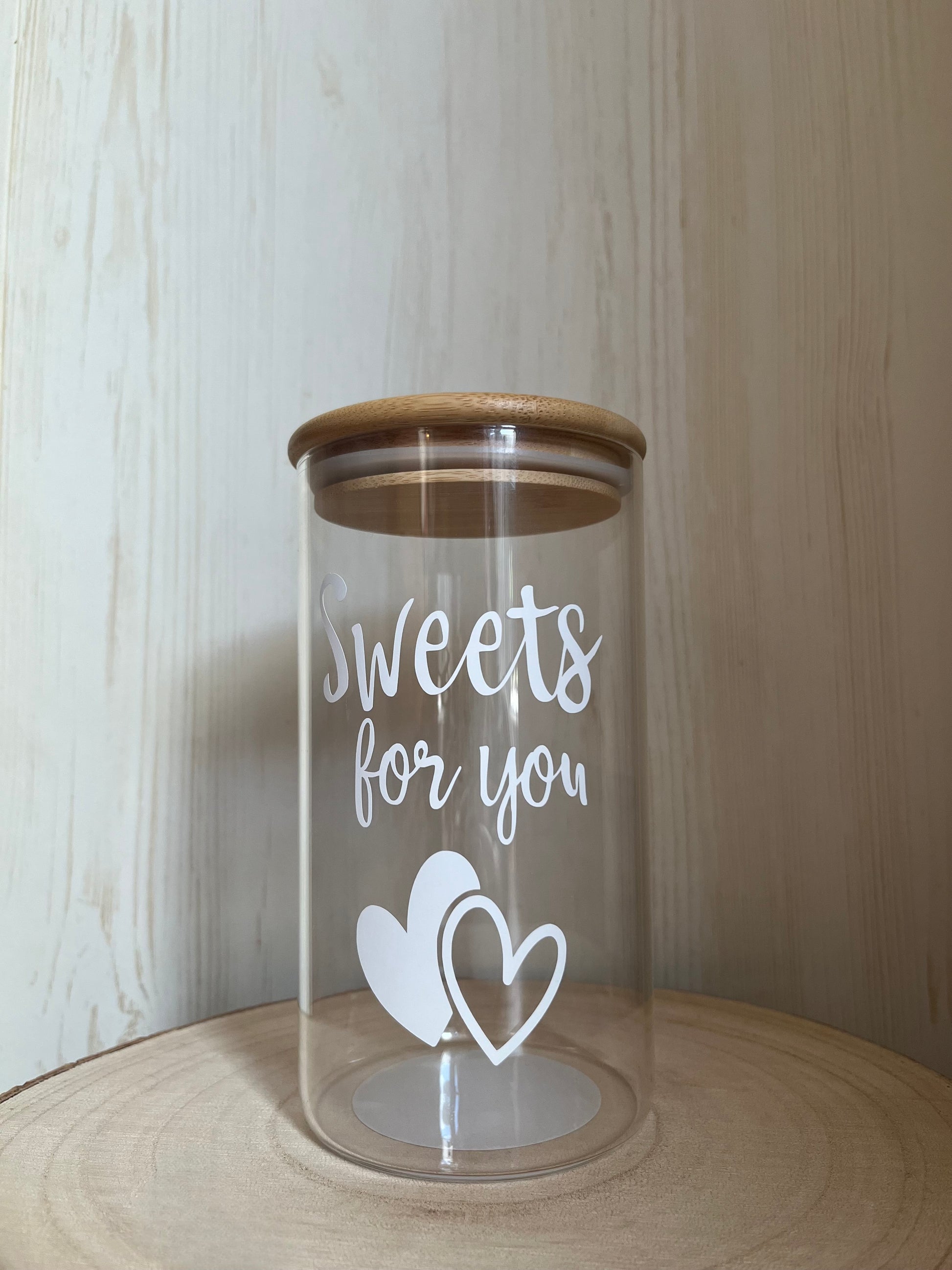 Dieses hübsche Glas mit der Aufschrift „Sweets for you“ ist das perfekte kleine Geschenk für besondere Menschen – oder für dich selbst. Ideal zum Befüllen mit Süßigkeiten, kleinen Überraschungen oder liebevollen Botschaften.