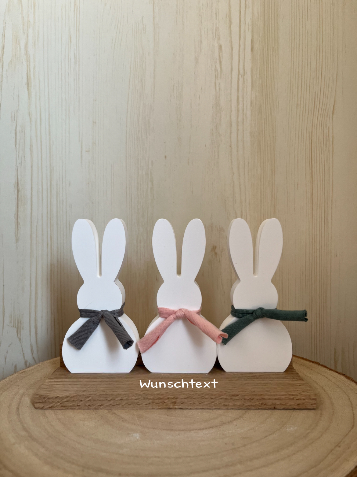 Die Hasen werden durch zarte Stoffschleifen in harmonischen Farben sowie eine Klötzchenleiste mit auswählbarem Text liebevoll ergänzt – zurückhaltend gestaltet und dennoch voller Charme.