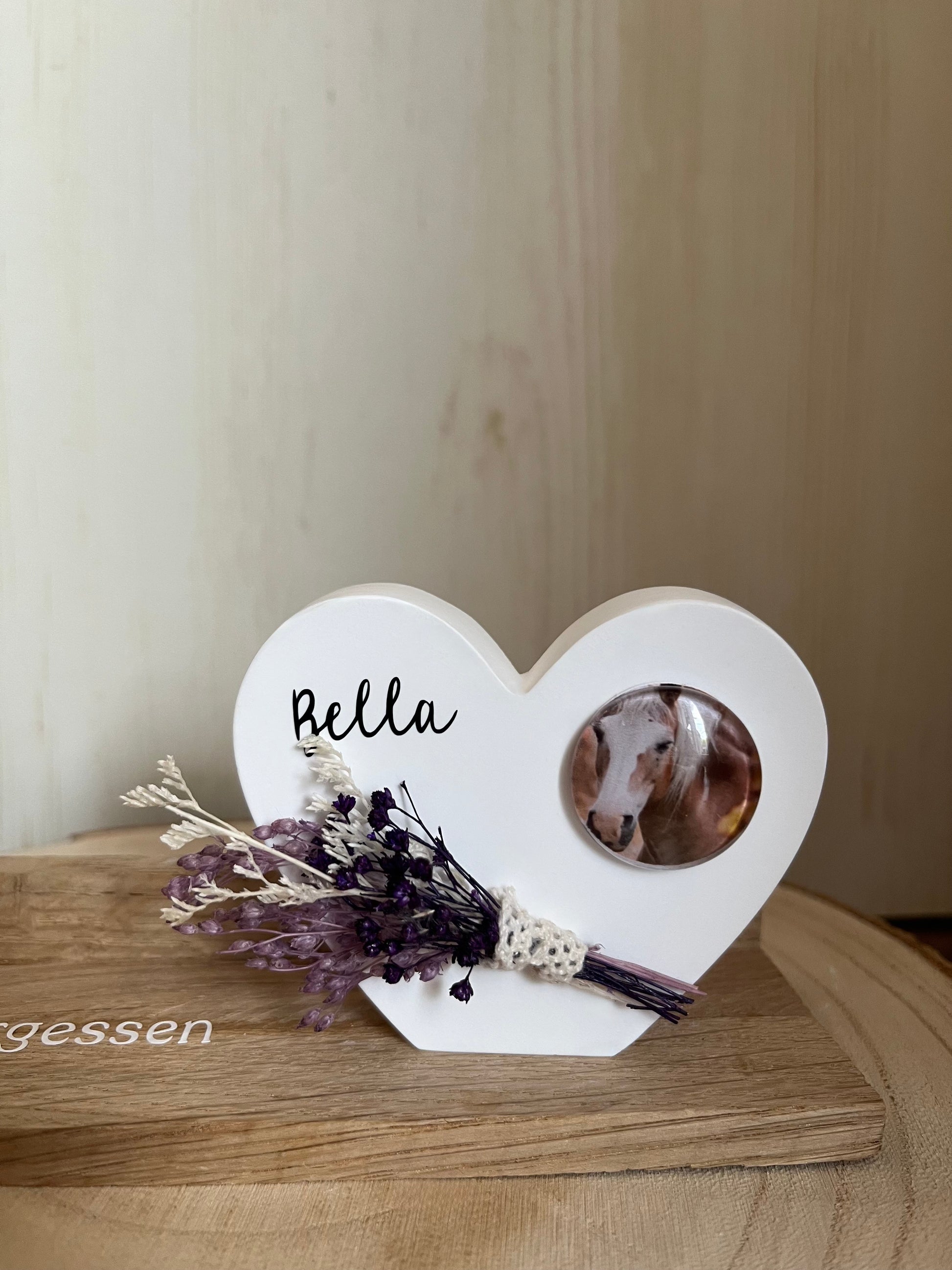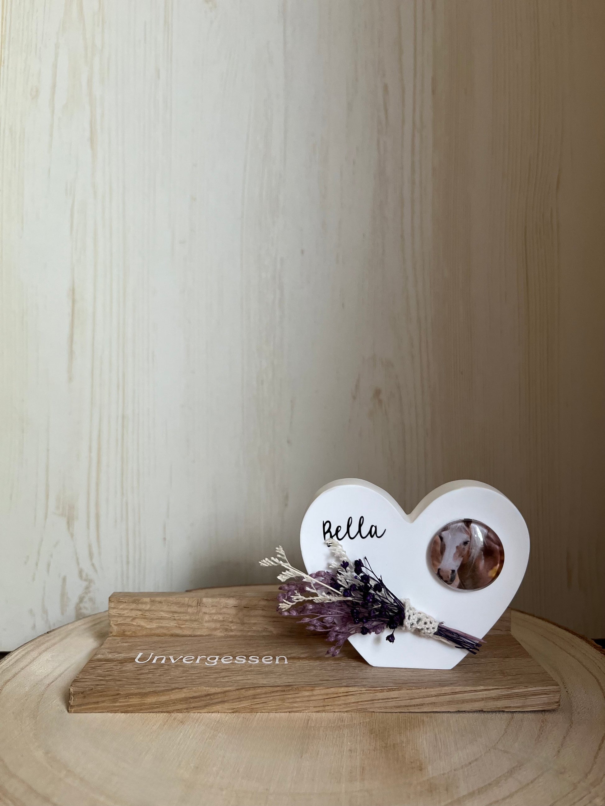 Mit dem Namen deines treuen Begleiters, einem persönlichen Foto und einem feinen Trockenblumenstrauß entsteht ein liebevolles Erinnerungsstück voller Wärme und Dankbarkeit.