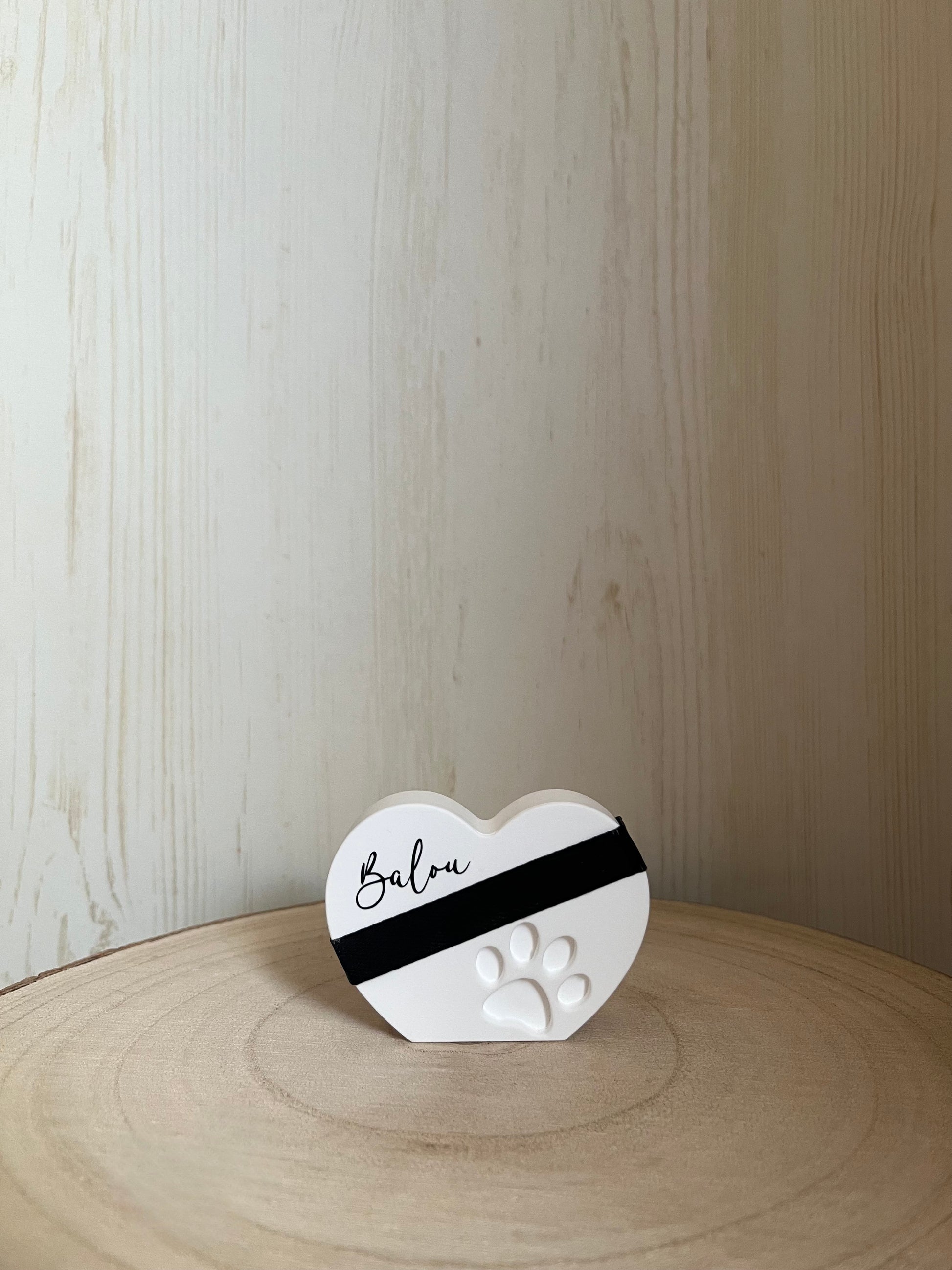 Dieses personalisierte Herz erinnert auf liebevolle Weise an einen treuen Begleiter, der für immer einen Platz im Herzen behält. Mit Namen und schwarzem Band gestaltet – schlicht, stilvoll und voller Bedeutung.