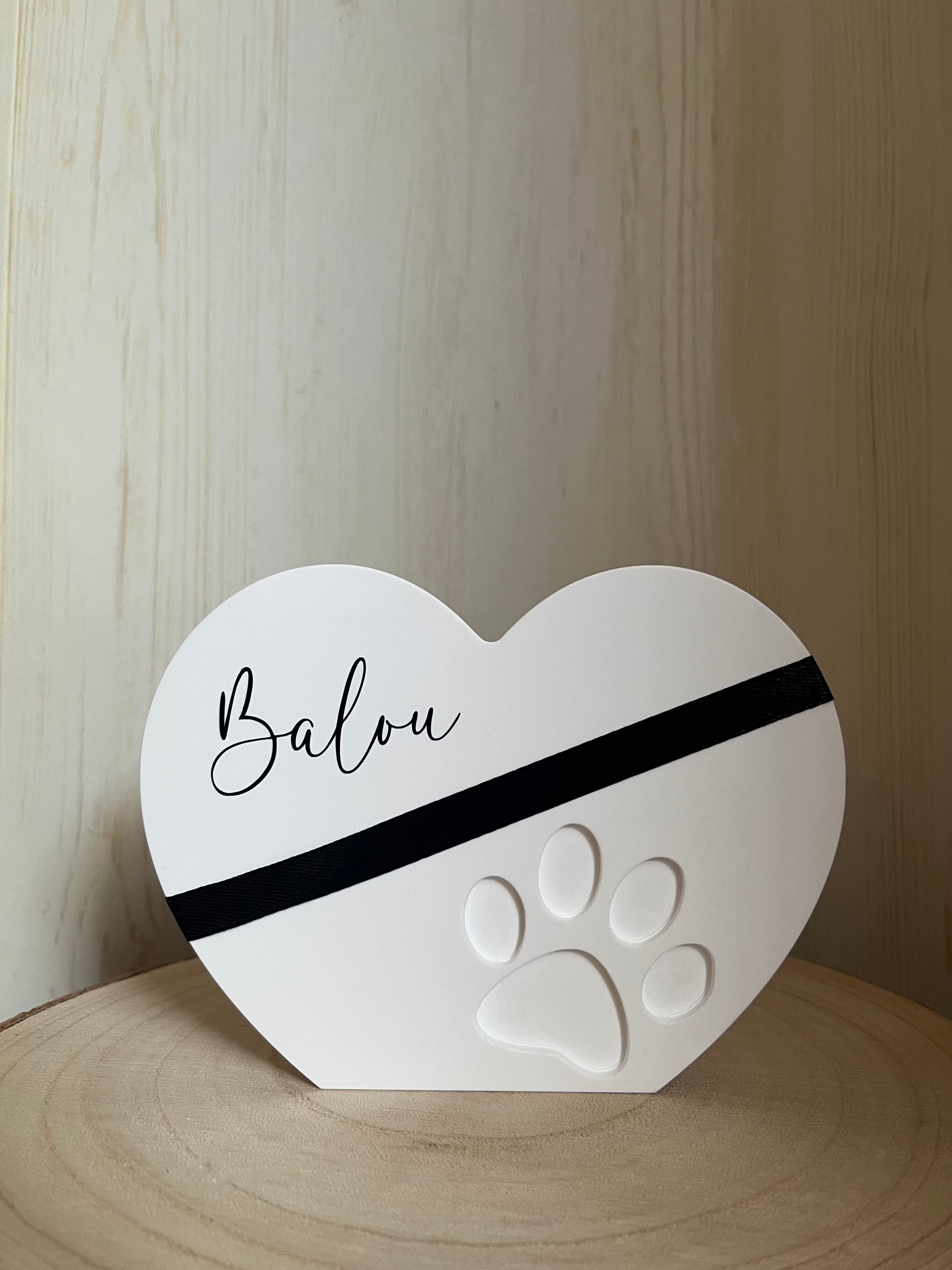 Dieses personalisierte Herz erinnert auf liebevolle Weise an einen treuen Begleiter, der für immer einen Platz im Herzen behält. Mit Namen und schwarzem Band gestaltet – schlicht, stilvoll und voller Bedeutung.