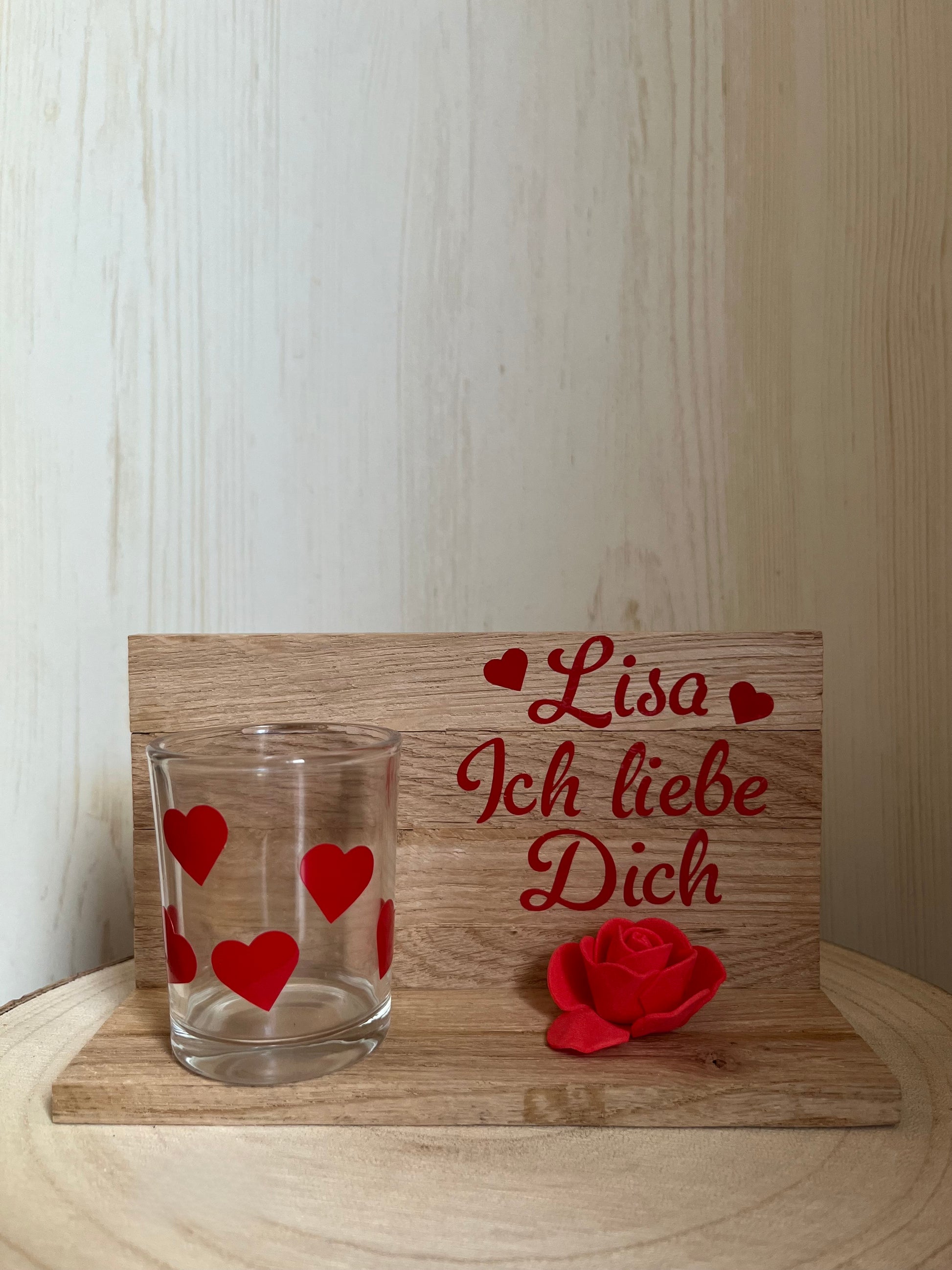 Ein kleines Geschenk mit großer Wirkung: Dieses liebevoll gestaltete Set besteht aus einem Teelichtglas mit farbigen Herzen und einer Klötzchenwand mit der Botschaft Ich liebe Dich und deinem Wunschnamen.