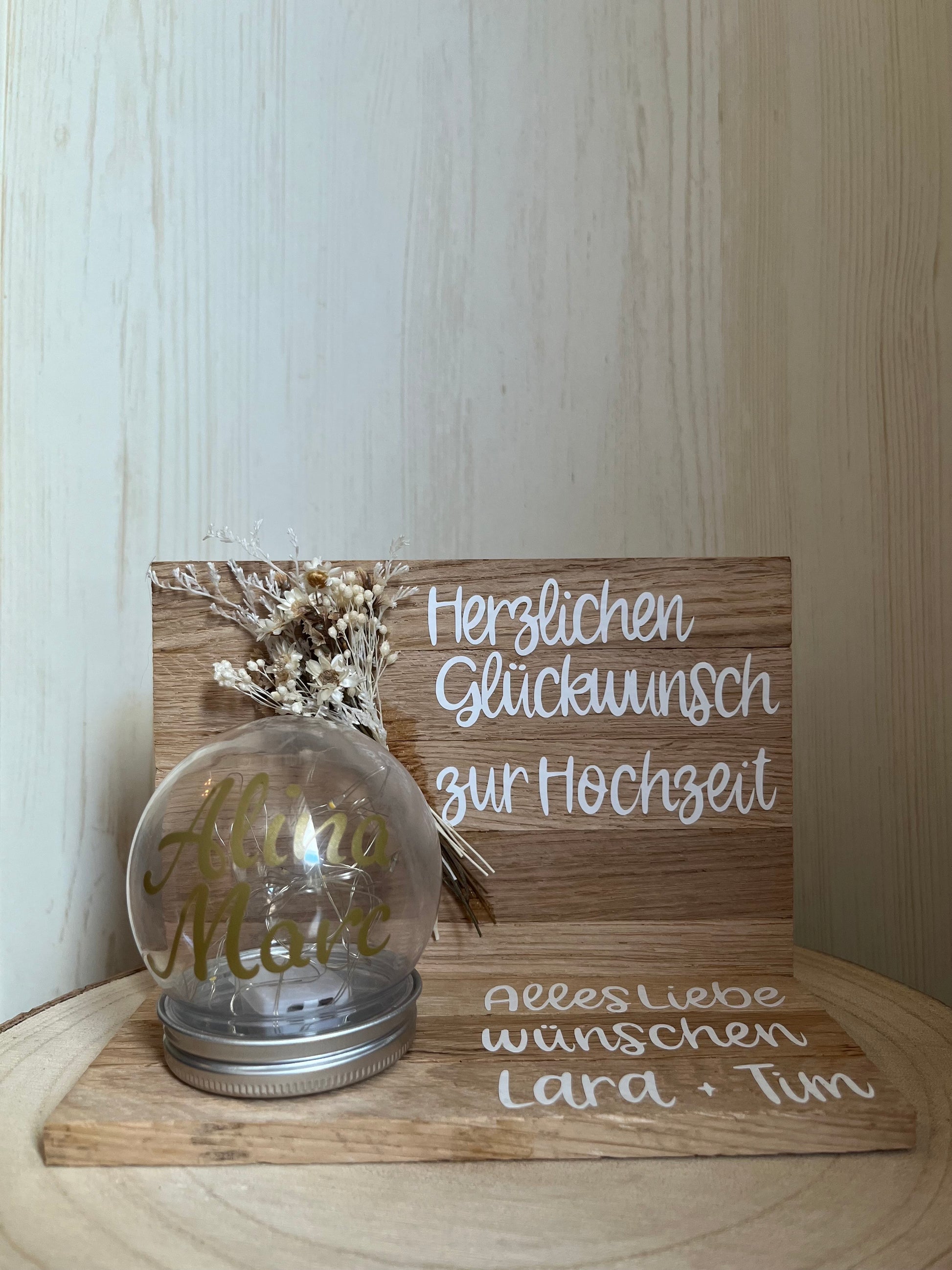 Klötzchenwand mit Blumen und Leuchtkugel personalisiert zur Hochzeit