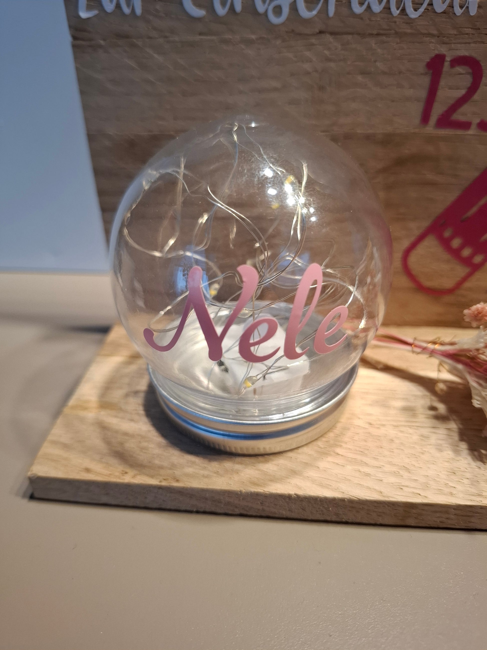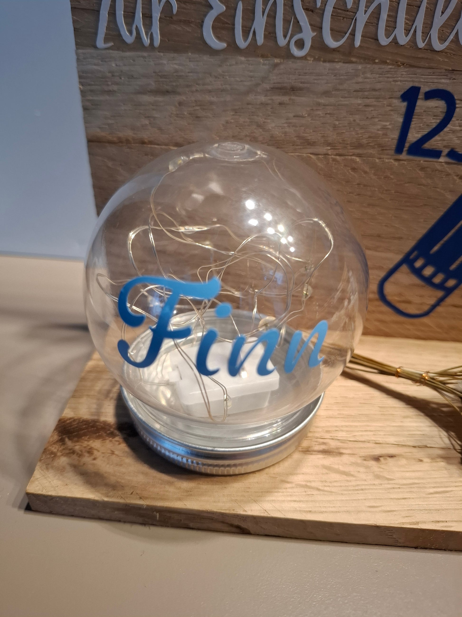 Die beleuchtete Kunststoff-Kugel mit dem Namen des 1.Klässlers lässt sich öffnen und somit perfekt für Geldgeschenke nutzen. Innenliegend befindet sich auch der Schalter für die batteriebetriebene Leuchte.