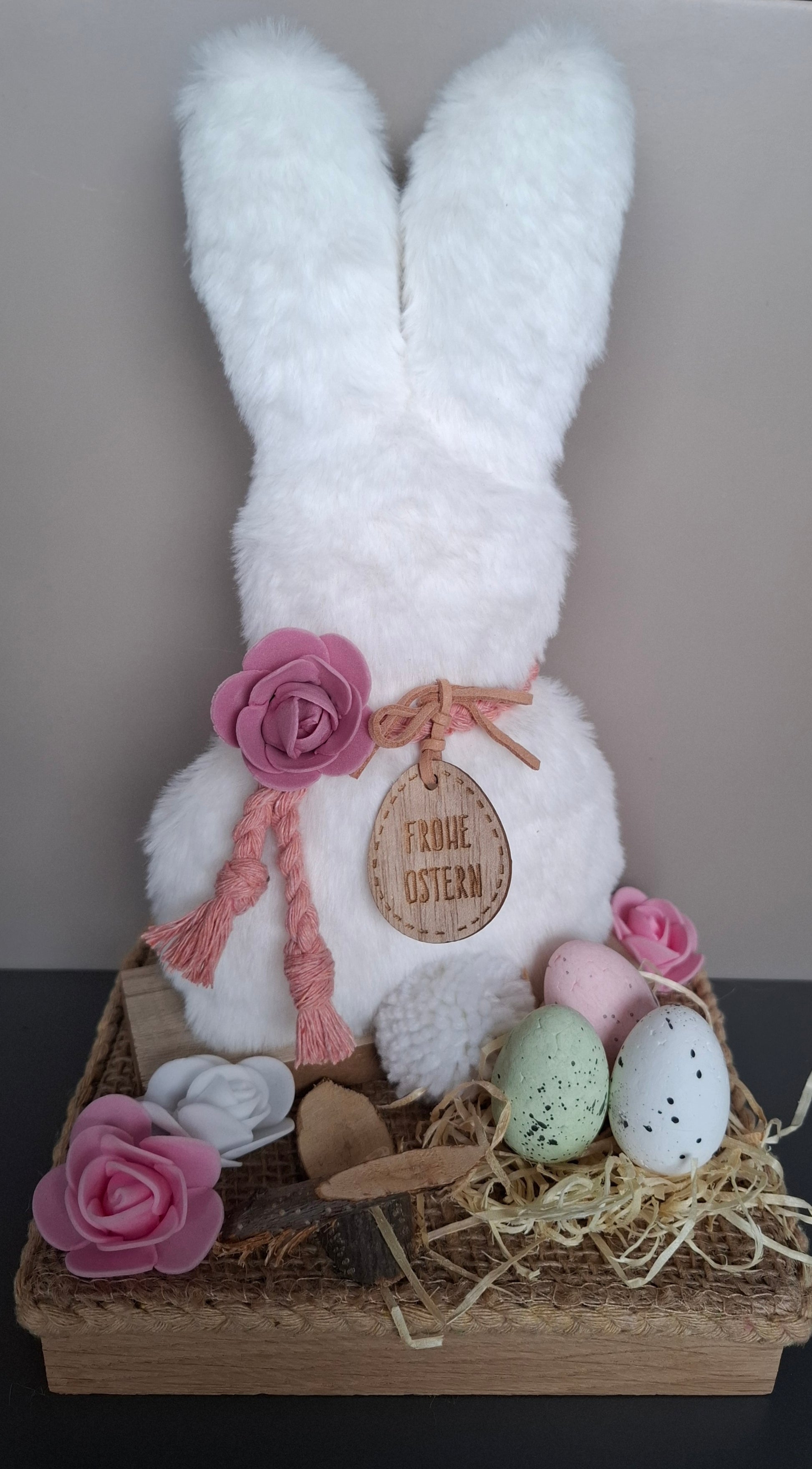 Osterdekoration - Plüschhase auf Podest mit Rosenblüten und Osternest ca. 16 x 27,5 cm weiss