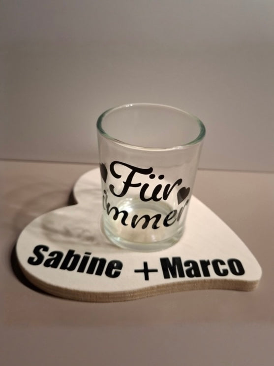 Wie wäre es dann mit diesem Teelichthalter aus Holz? Beschriftet wird er mit euren Namen. Passend dazu erhaltet ihr das Teelichtglas mit der Aufschrift Für immer.