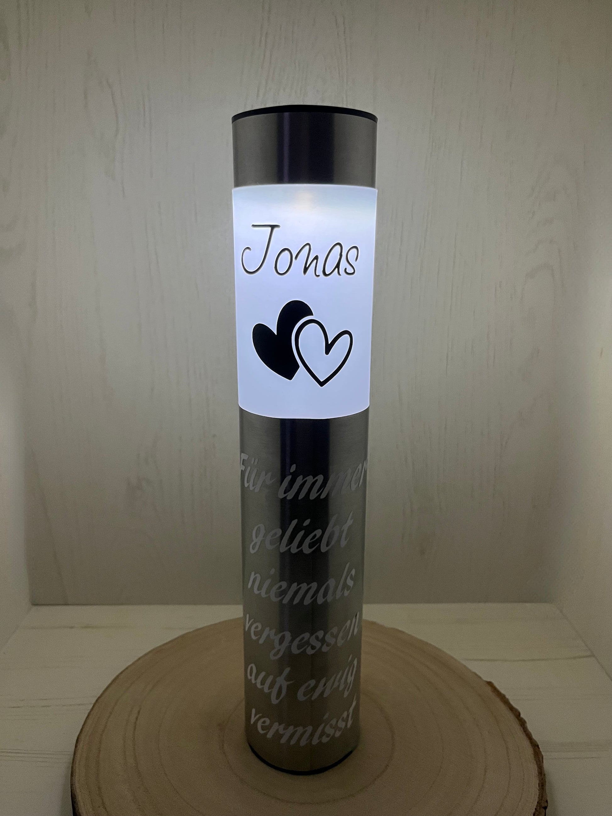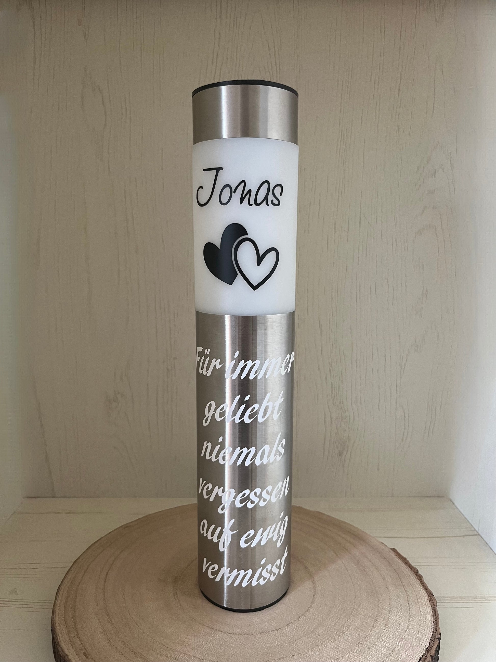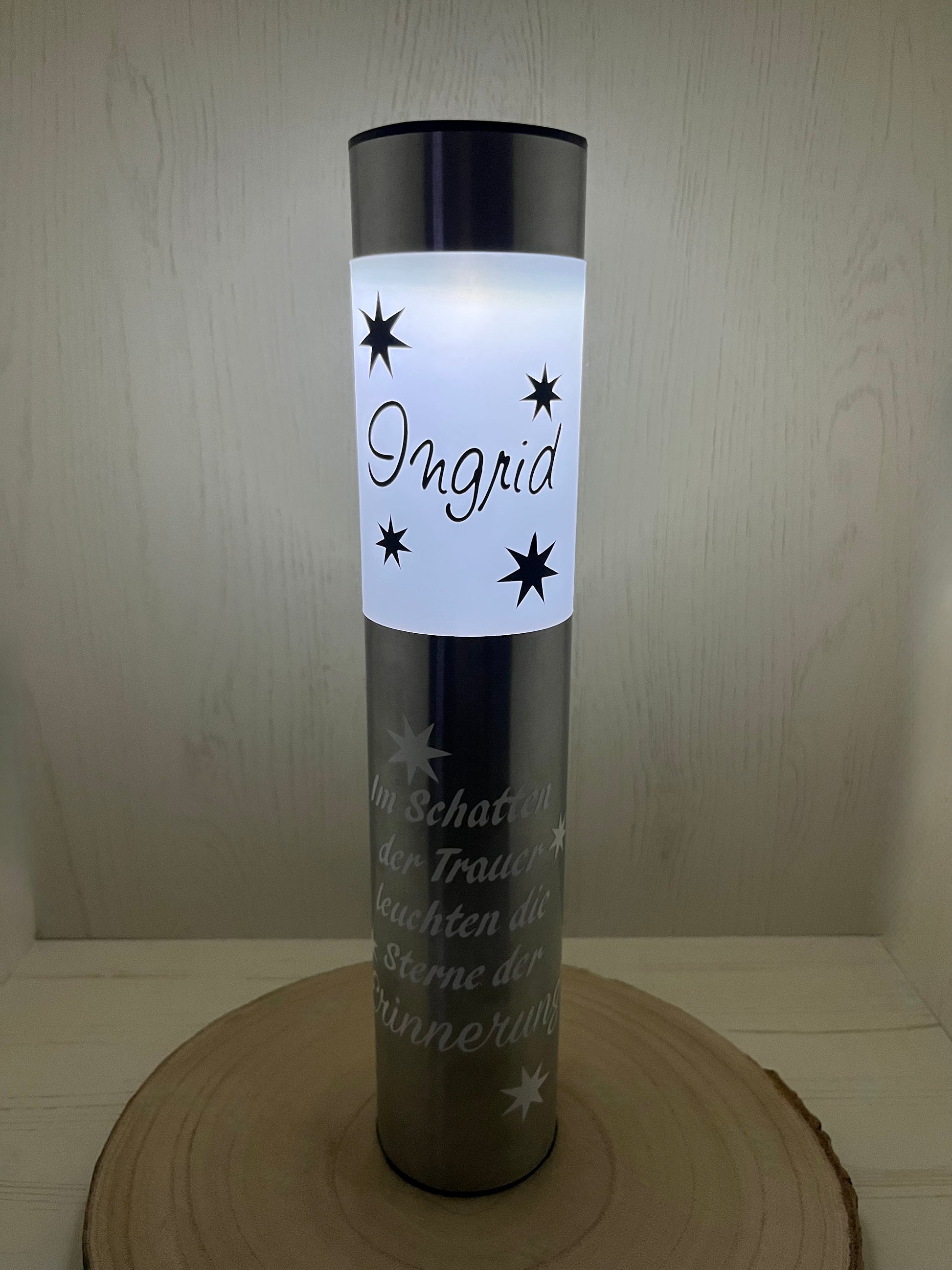 Die Solarlampen bestehen aus poliertem Edelstahl und wirken hierdurch bereits sehr elegant und hochwertig. Ein zusätzliches Highlight besteht darin, dass der Name Deines Angehörigen auf der beleuchteten Fläche aufgebracht wird.