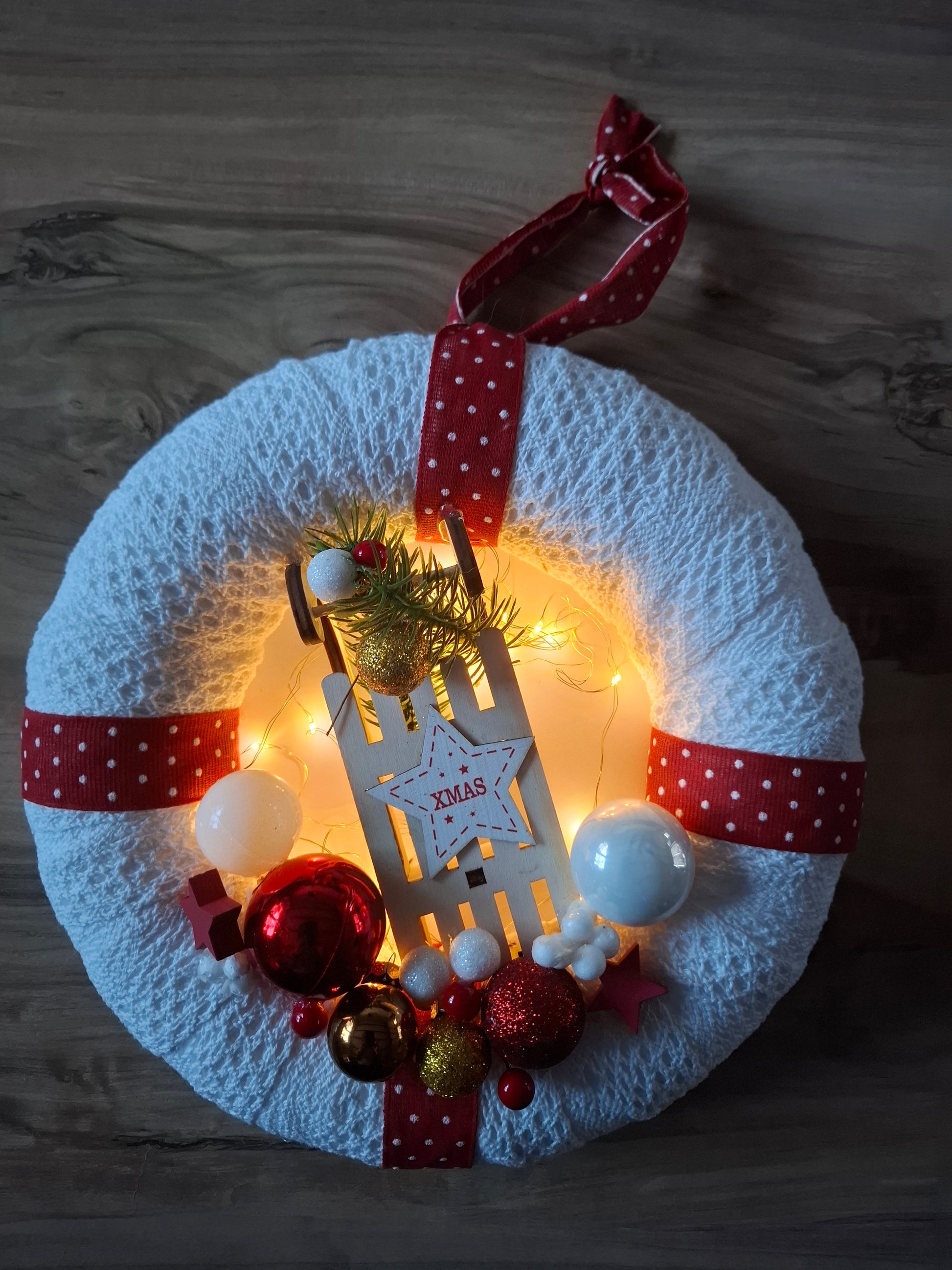 Gefertigt ist der Kranz aus einem Styroporring, den ich mit einer weißen Bordüre umwickelt habe. Die roten Bänder bilden einen schönen Kontrast und die eingebrachten Deko-Elemente sorgen für ein stimmiges Gesamtbild.